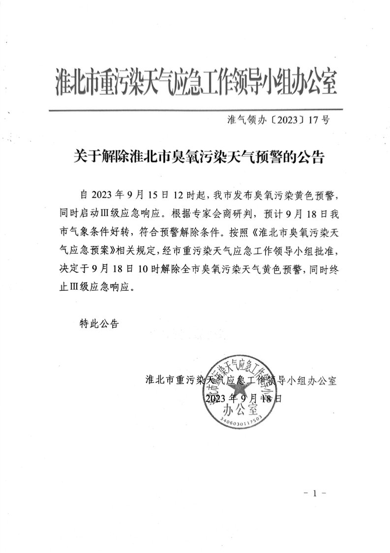 淮氣領(lǐng)辦〔2023〕17號關(guān)于解除淮北市臭氧污染天氣黃色預(yù)警的公告