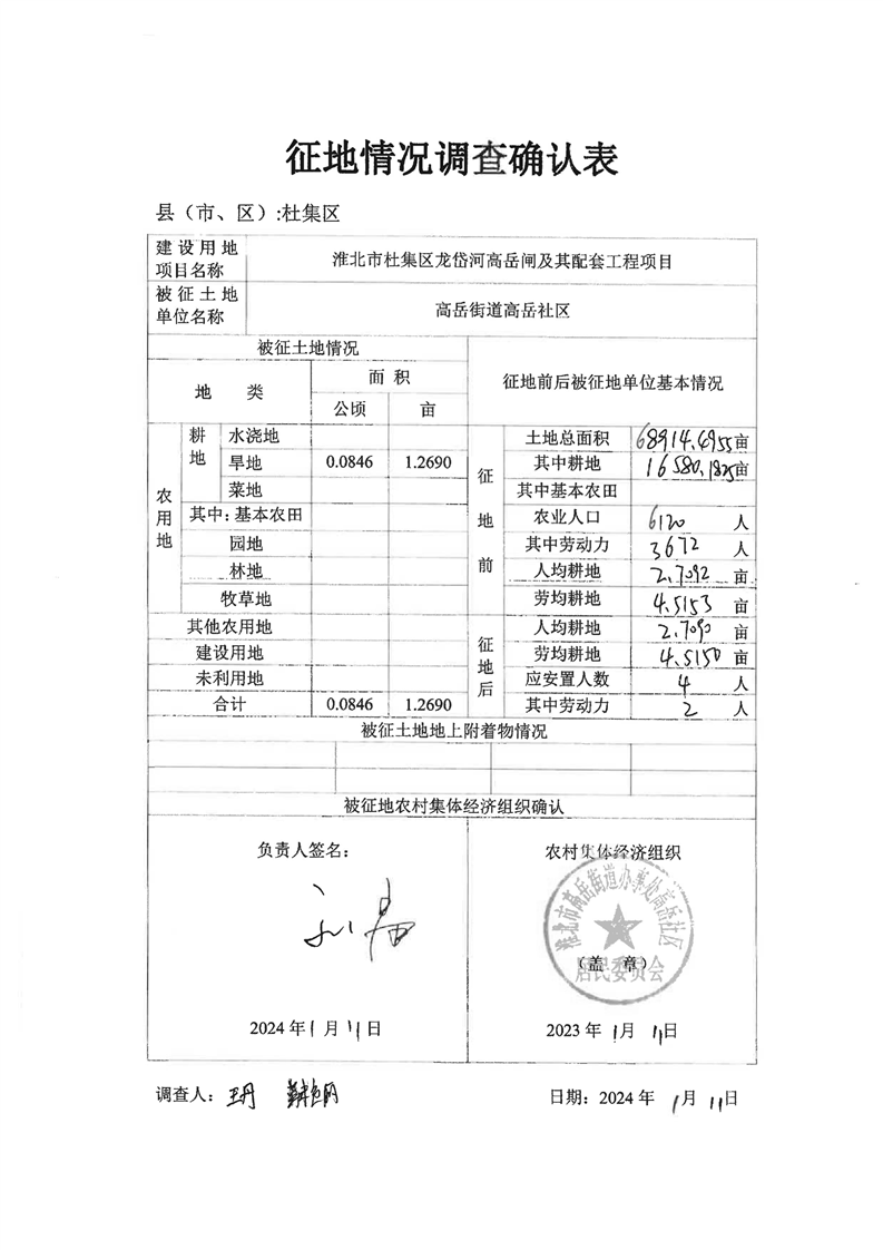 淮北市杜集區(qū)龍岱河高岳閘及其配套工程項(xiàng)目征地情況調(diào)查確認(rèn)表