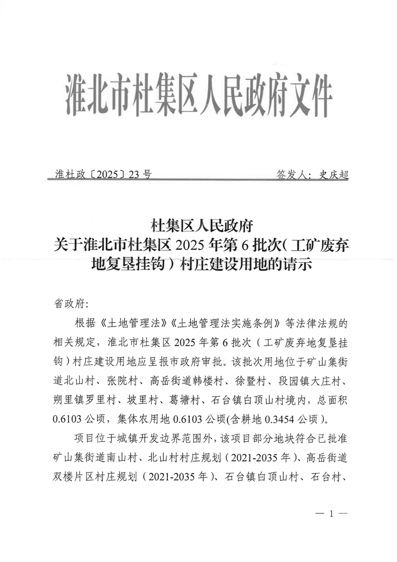 杜集區(qū)人民政府關于淮北市杜集區(qū)2025年第6批次(工礦廢棄地復墾掛鉤)村莊建設用地的請示